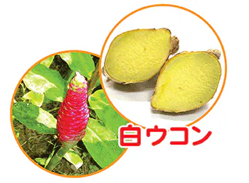 白ウコンは別名ハナショウガと言い、柑橘系の独特な芳香と生物活性を持つ精油成分[ゼルンボン」が特徴で、白い根茎をしていることから、この名で呼ばれています。国内産(沖縄産)でウコン商品として根茎が使用されている例は他になく、非常に希少な種類です。白ウコンも春ウコン同様、「自分で治す力」を増強する作用があります。さらに白ウコンエキスが化粧品などの原材料で使用されている例があるように、体の中から綺麗にする力で美肌も期待される珍しいウコンです。