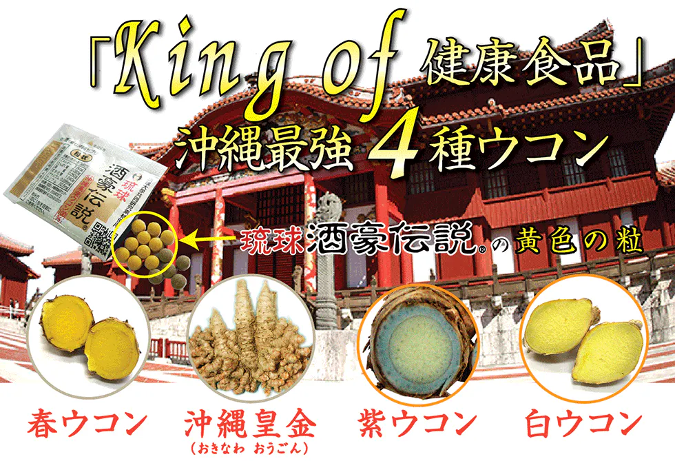 『沖縄皇金(おきなわおうごん)』を使用している点。高い抗酸化活性成分「テトラヒドロクルクミン(以下T.H.C)」を通常の 秋ウコンの22倍も多く含有する奇跡のウコンで、 H17年、製造元が天皇杯を受賞しています。通常クルクミンは小腸でT.H.Cへと変化しますが、こ の沖縄皇金は最初からT.H.Cのまま含有しているので クルクミンの吸収率が非常に良いということが 分かっています。