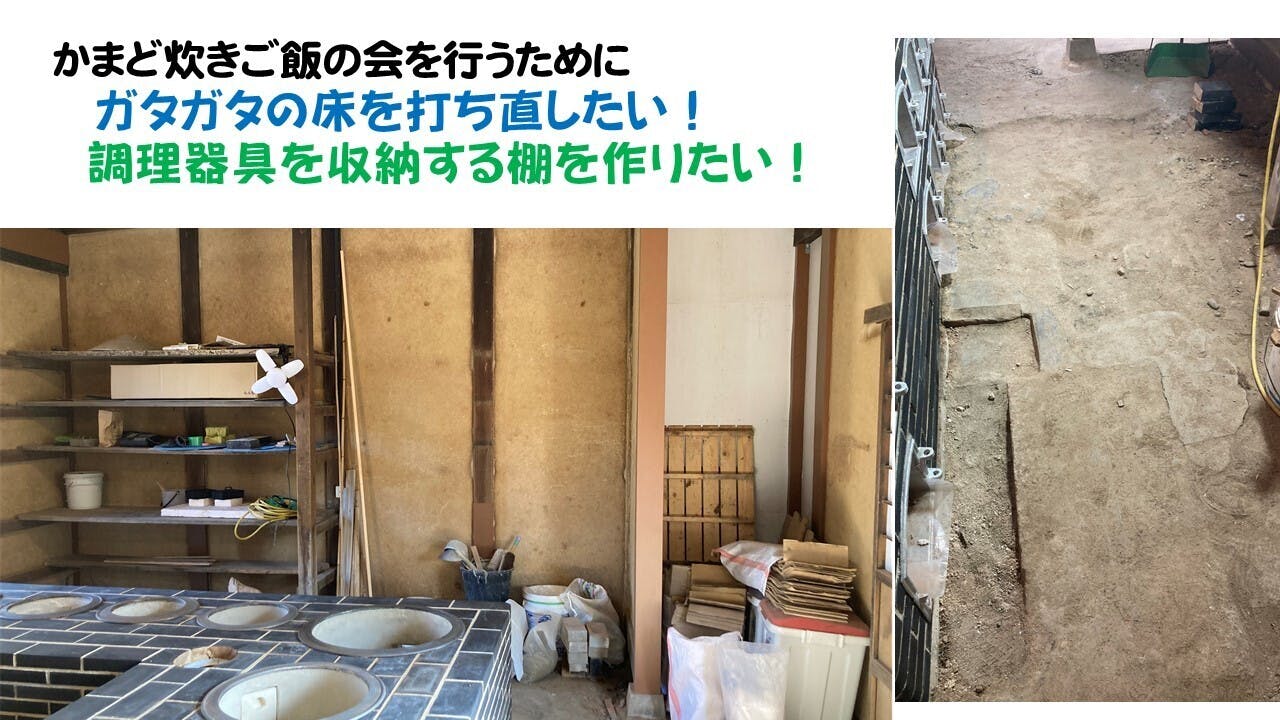 かまども完成に近づき、かまど炊きご飯体験を行うことを現実的に考え始めると、ガタガタの床を何とかしたいとか、鍋・釜・調理器具の収納のために棚が必要とか、誰もが出入りできるオープンなスペースなので、包丁や薪割りの斧などの収納は鍵がかけられなきゃいけないとか、整備したいところがいろいろ出てきました。実際にかまどを活用して集える場にしていくために、もう一段のご支援をお願いします。