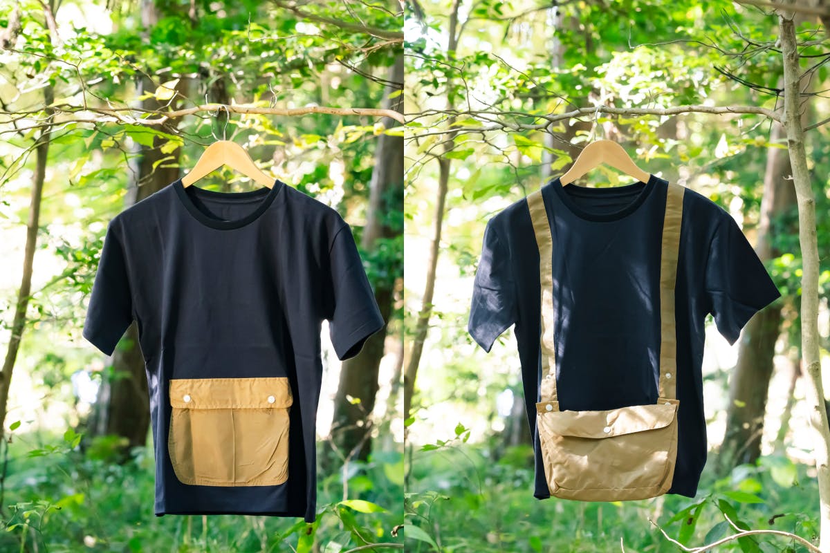 ポケット部分の生地は地元のリサイクル業者と協力して、使われなくったテントやタープの生地を裁断/整形して再利用し、1つとして同じ柄がない”オンリーワン商品”に仕立てます。