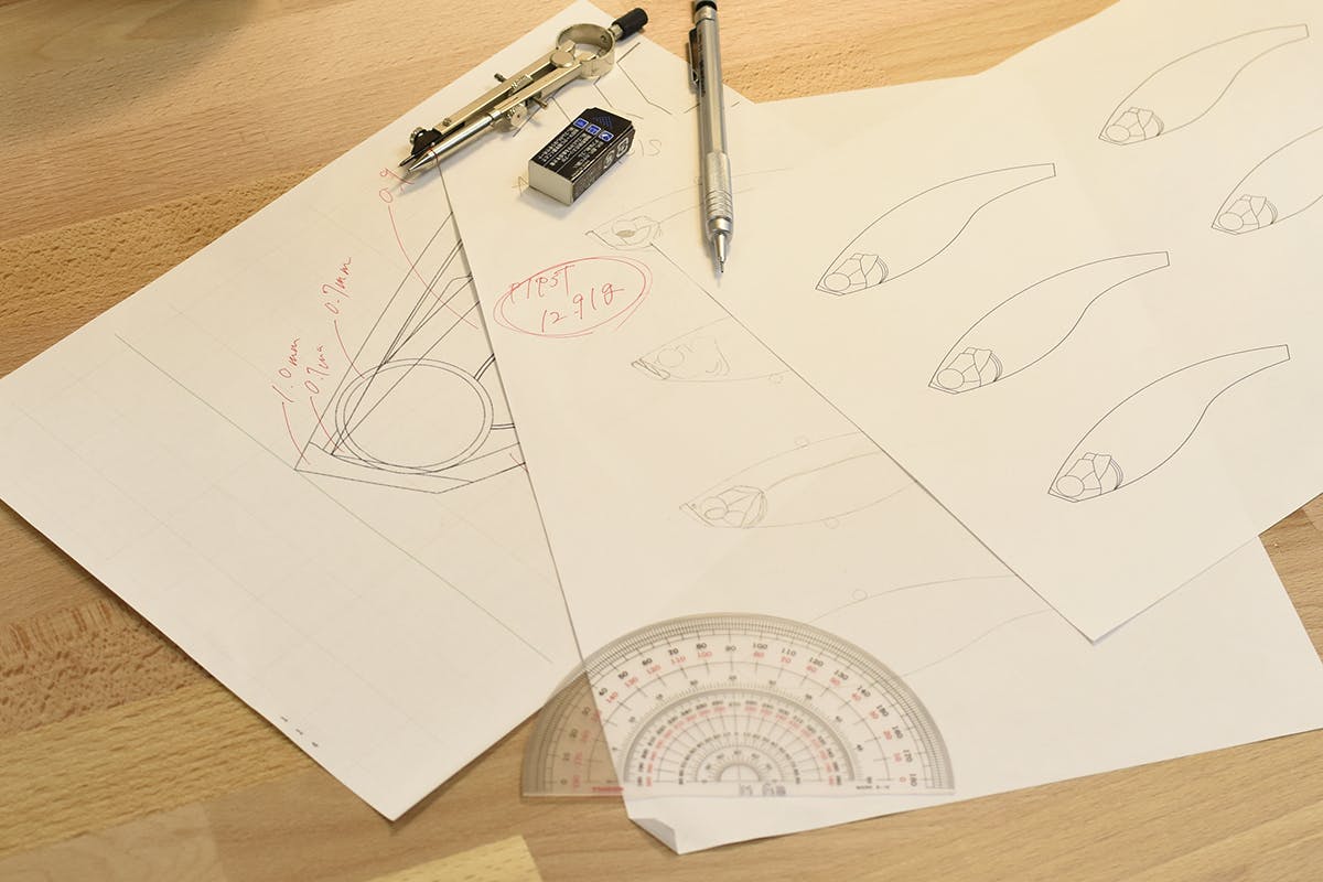 フリーハンドでルアーの形やエラの模様を頭の中のイメージ通りに書き出します。エラの凹凸やエイト環の溝、ルアーの厚みなども詳細に書き出します。