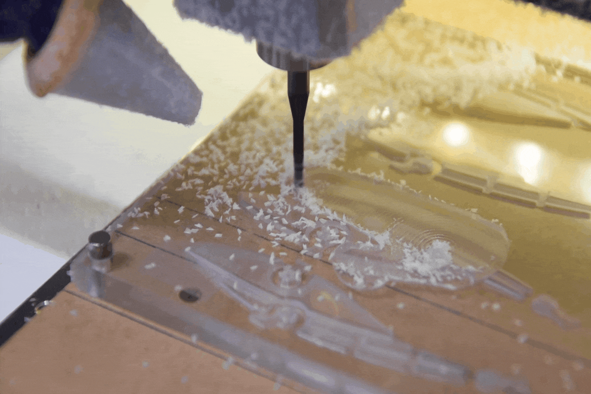 切削マシンを使用しABSの樹脂板からルアーを0.01mmの精度で削り出します。とても時間がかかりますが、射出整形品とほとんど変わらないルアーを削り出すことができます。