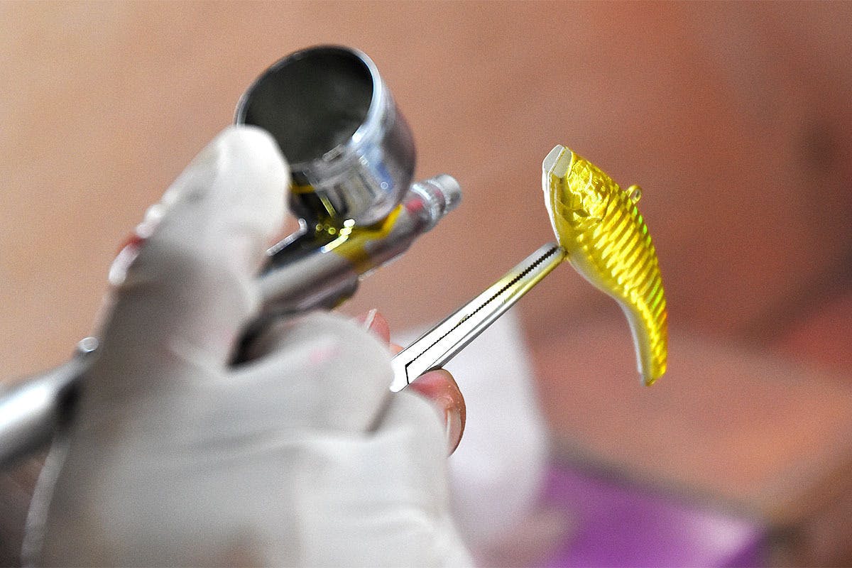 自社工場にて1つ1つ塗装を施します。削り出したルアーにホログラムを転写しカラーを塗装、仕上げに2液性のウレタンでコーティングしプロトタイプが完成します。