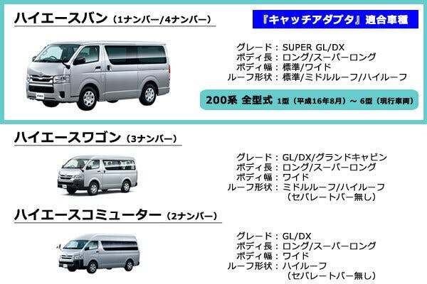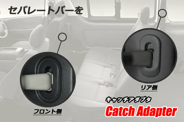 『キャッチアダプタ』はセパレートバーの形状に合わせた専用設計のため、ハイエースバンの型式やグレード、ボディの長さや幅、さらにはルーフ形状に関係なく全てのハイエースバンに適合します。