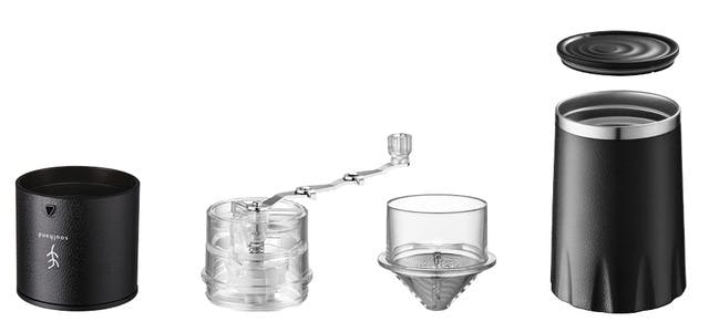 ミル、ドリッパー、コーヒーケトル、タンブラーがコンパクトにワンセット。