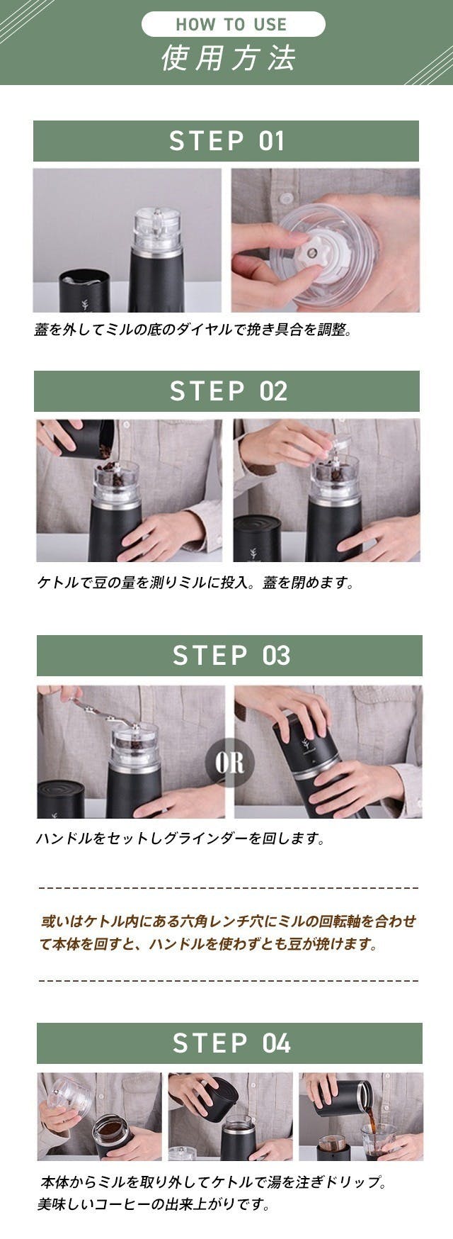【ポータブルコーヒーミル】はミル、ドリッパー、ケトル、タンブラーが