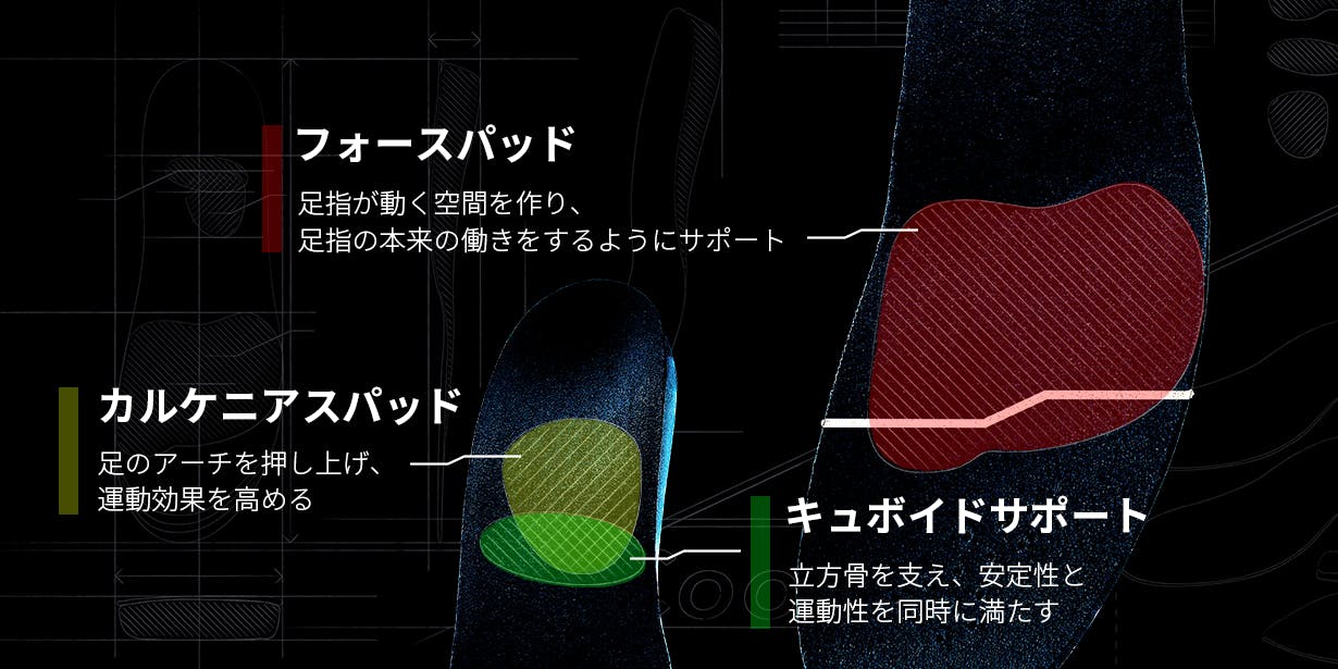 特許技術の、足の中の核となる「立方骨」を支える構造により、