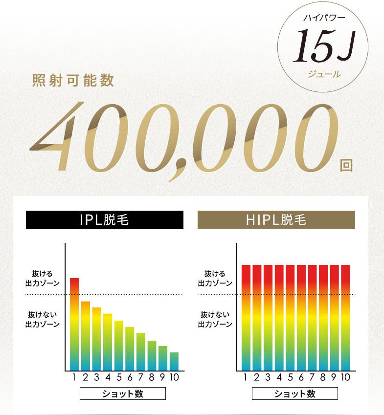 たった一台でたっぷり使える40万発以上の照射回数で、1,000回以上お使いいただけます。今なら1台で5万円以下でお得にお求めいただけるため、実質無制限で1発わずか0.1円です!