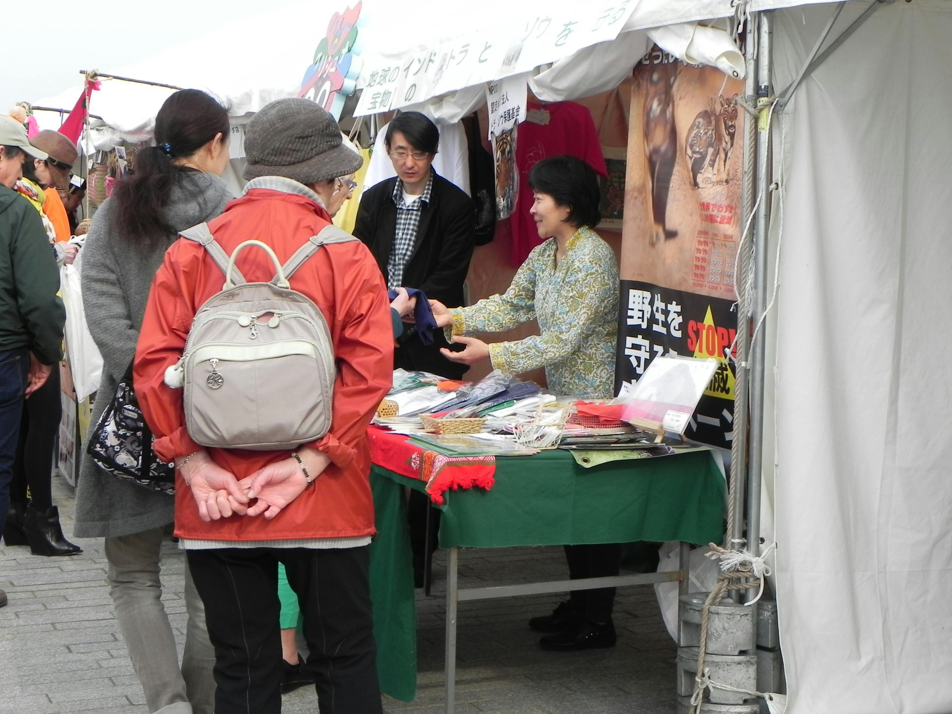 写真パネルで野生動物の現状をお知らせし、グッズ販売も盛況でした。
