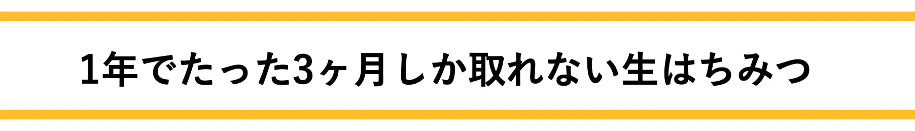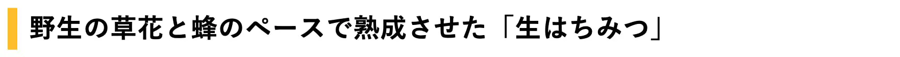 生はちみつは、すべて野生に咲く花の蜜からできています。野生の草花が咲くのは、1年でたった3ヶ月。限られた期間でしか咲かない野生の草花と蜂のペースで熟成させた、栄養価の高い「奇跡の生はちみつ」とも言えるのです。