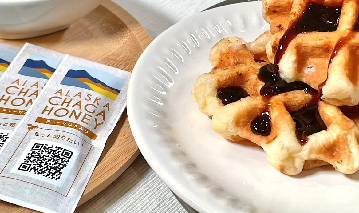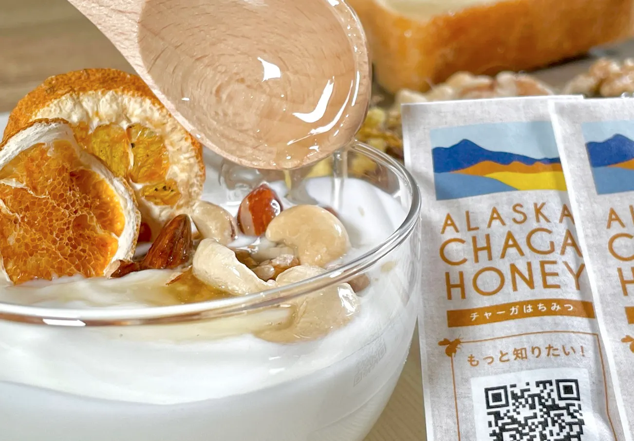 アラスカ産、非加熱・非加糖・酵素が生きたままの「生はちみつ」と近年高い健康効果が明らかになっている貴重なキノコ「チャーガ」を混ぜたチャーガはちみつ。