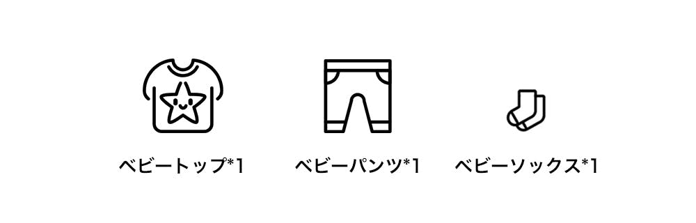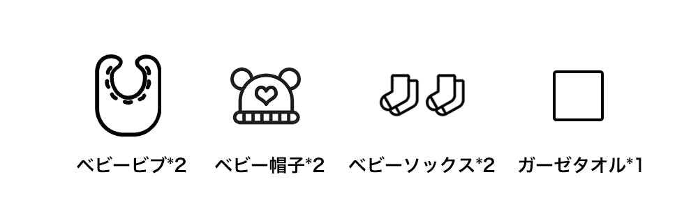 ベビー服やスタイ2枚+帽子2枚+靴下2足+ガーゼタオル1枚・・・。