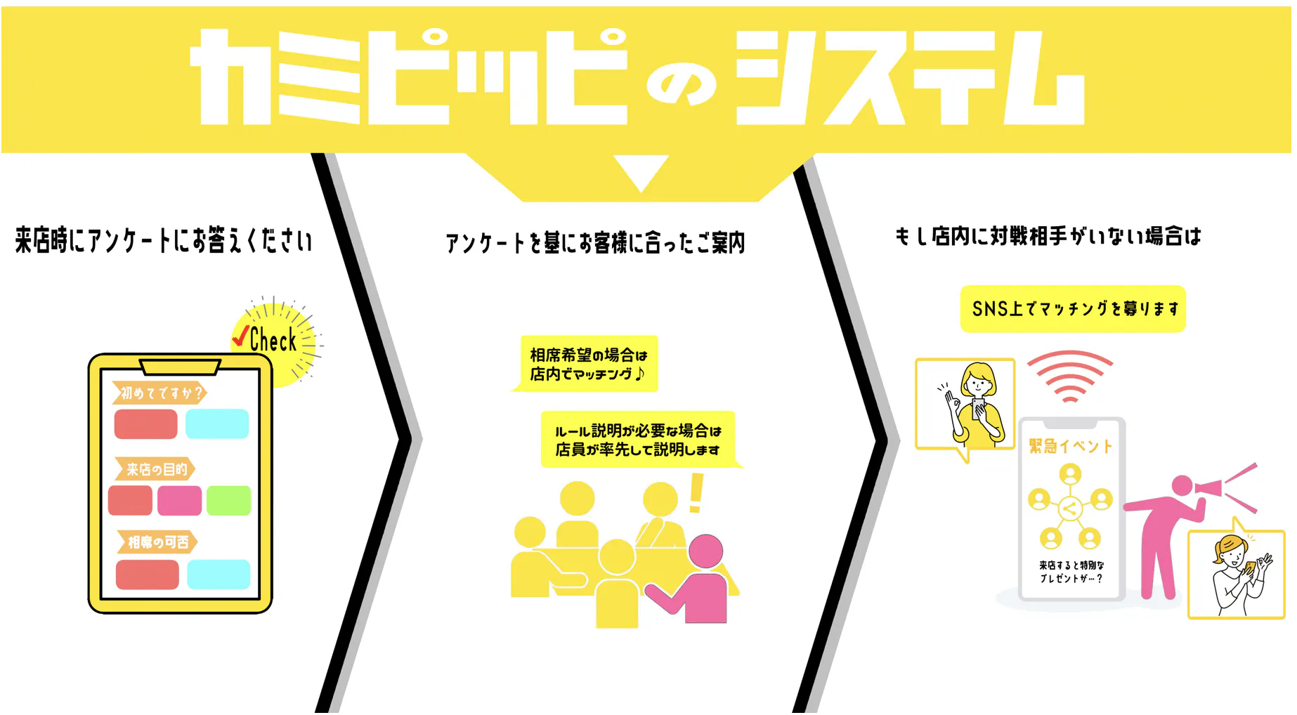 とにかく、カミピッピにきたら対戦できる!そう思って頂けるような環境作りを目指します。