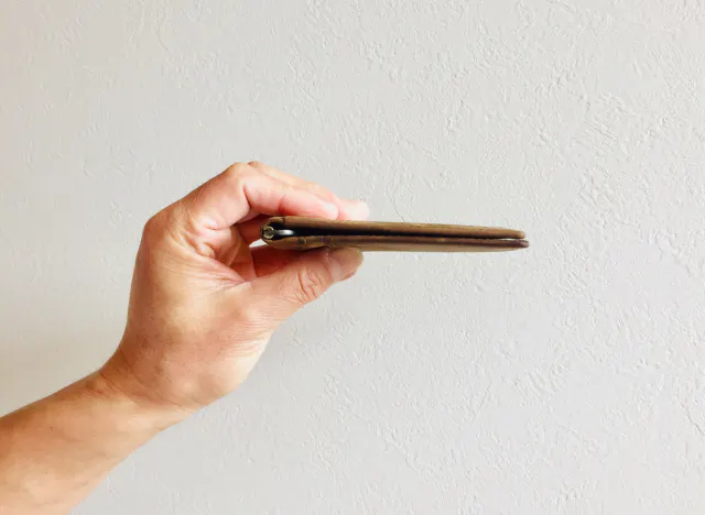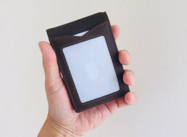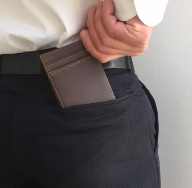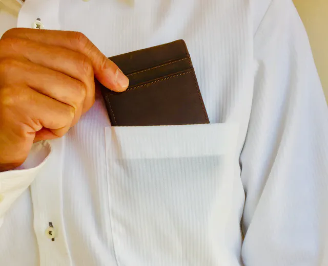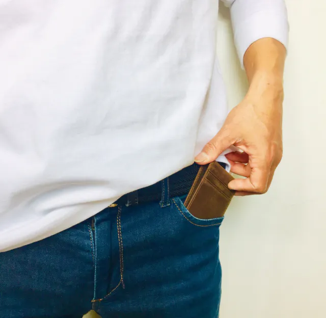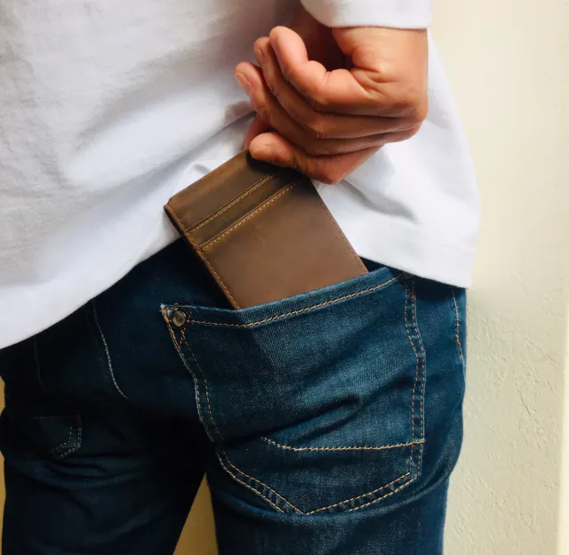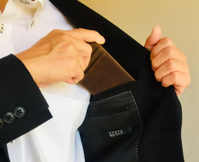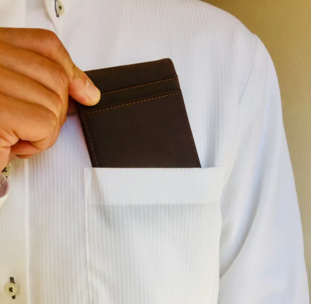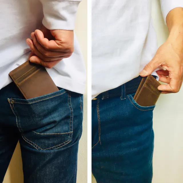 ズボンの後ろポケットに入れても長財布のようにはみ出さず、前ポケットに入れても動きの邪魔になりません。薄くコンパクトサイズなのでシャツの胸ポケットやジャケットのポケットにもスマートに出し入れ出来ます。