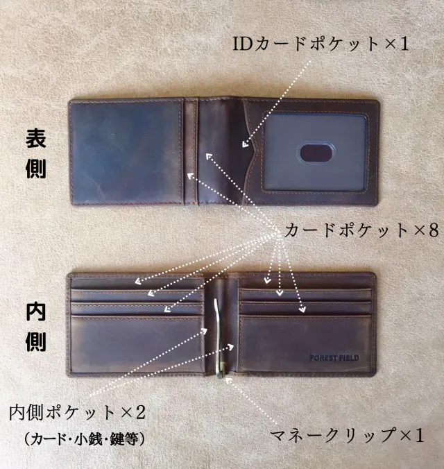 【FOREST FIELD】はお札を挟むマネークリップ、内側ポケットには鍵や小銭、カード類を収納するカードポケット、身分証などを入れるIDウィンドウポケットとコンパクトながら全ての機能を持ち合わせてます。