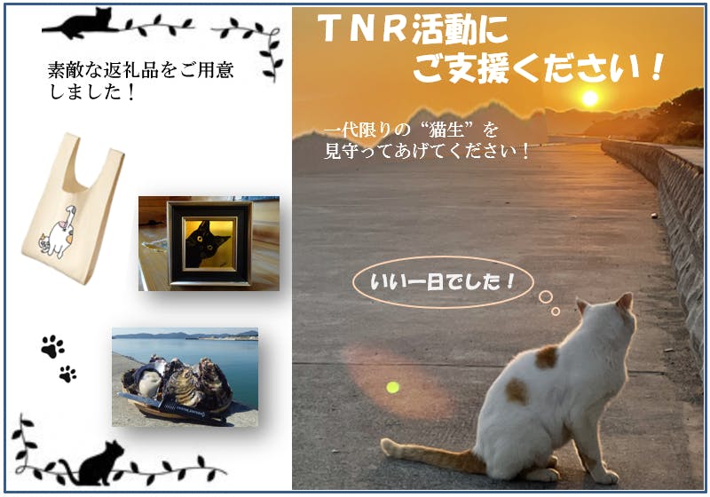 今回、赤穂市企画政策課戦略プロデューサーの西村淳一さんにご協力をいただき、クラウドファンディングをすることで、野良猫のTNR(不妊手術)活動を知って頂き、赤穂市で不幸な野良猫をこれ以上増やさないために、みなさまのご支援を募ることにいたしました。
