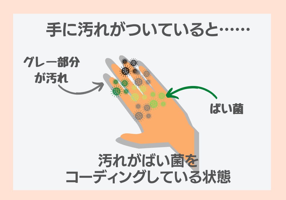 この“汚れ”が残ったまま上から消毒しても、“菌をやっつける”ことはできず、ウィルスや細菌は手に残ってしまいます。
