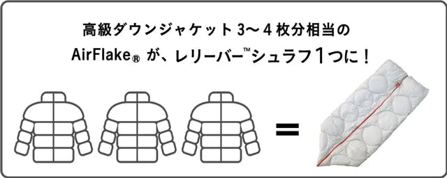 そして、レリーバー™シュラフ の中わた素材である「Air Flake®︎」は、羽毛の宝石と呼ばれる最高級羽毛「アイダーダウン」の形状や特を分析し、その特殊形状を繊維で生態模倣(バイオミメティクス)した、人工羽毛です。