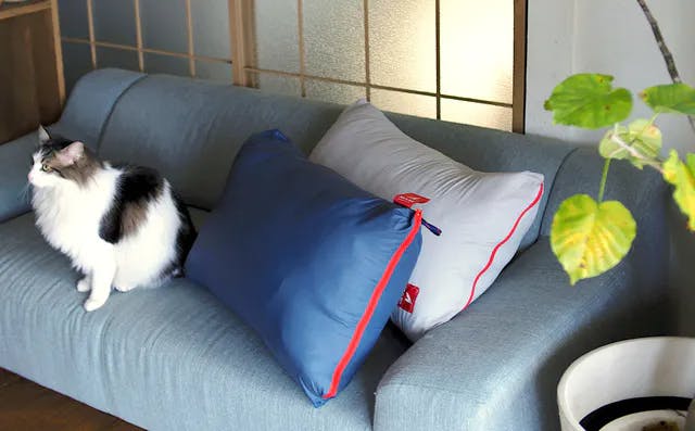 レリーバー™️シュラフは収納時にもAir Flake®️のふんわり感を感じていただけるように、便利な多目的クッションとなる専用収納袋が付属!簡単にしまうことができます。