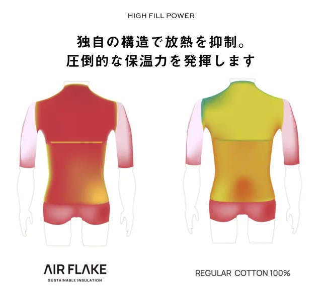 フィルパワー”とは、かさ高性を示す指標のこと。数値が高いほどかさ高く、空気を多く含む保温力が高いと言えます。中綿AirFlakeは研究の末にたどりついた 独自の構造で、放熱を抑制し、 圧倒的な保温力を発揮します。