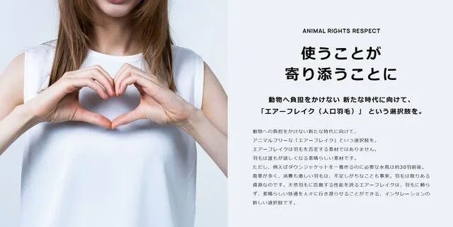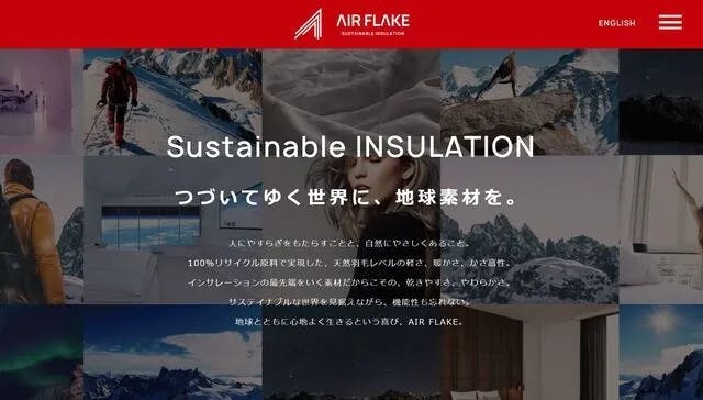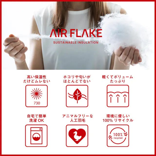100%リサイクル原料で作られ、限りある天然素材の羽毛に頼ることのないエアーフレイクは、まさにサステナブルな社会の実現に貢献できるインサレーションなのです。