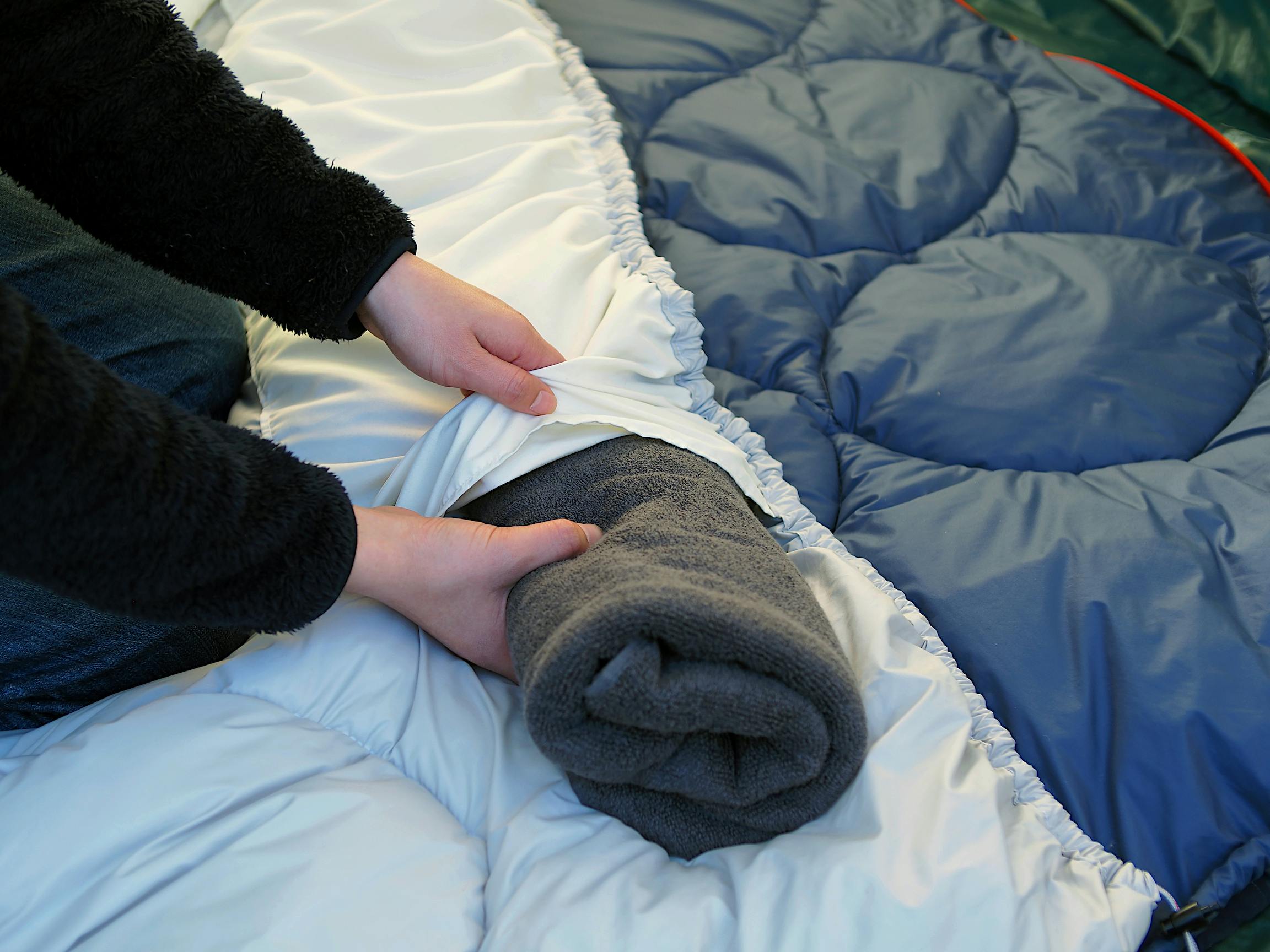 上部を絞ると、より空気を逃すことなく保温性が高まり、温かく眠れます。もちろん、封筒型としてもお使いいただけます。寝返りもしっかりうてて、AirFlake®️だから、軽やかでふんわりな寝心地です。