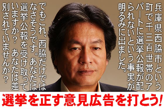 しかし、いま私は、自分の当落の問題は度外視しています。なぜなら、それよりももっと大きな問題にぶち当たってしまったからです。西脇で起こっていることは西脇だけの問題ではなく、日本全国の問題だと思うからです。これは日本の選挙制度全体の問題であり、日本の民主主義の問題であり、不平等な日本のあり方の問題だと思うからです。そのことに気づいたとき、私は、このことを日本全国に知らしめたいと思いました。そのために新聞に意見広告を打ちたいと思い、その資金を調達するため、広く皆様からご支援をいただきたいと思った次第です。