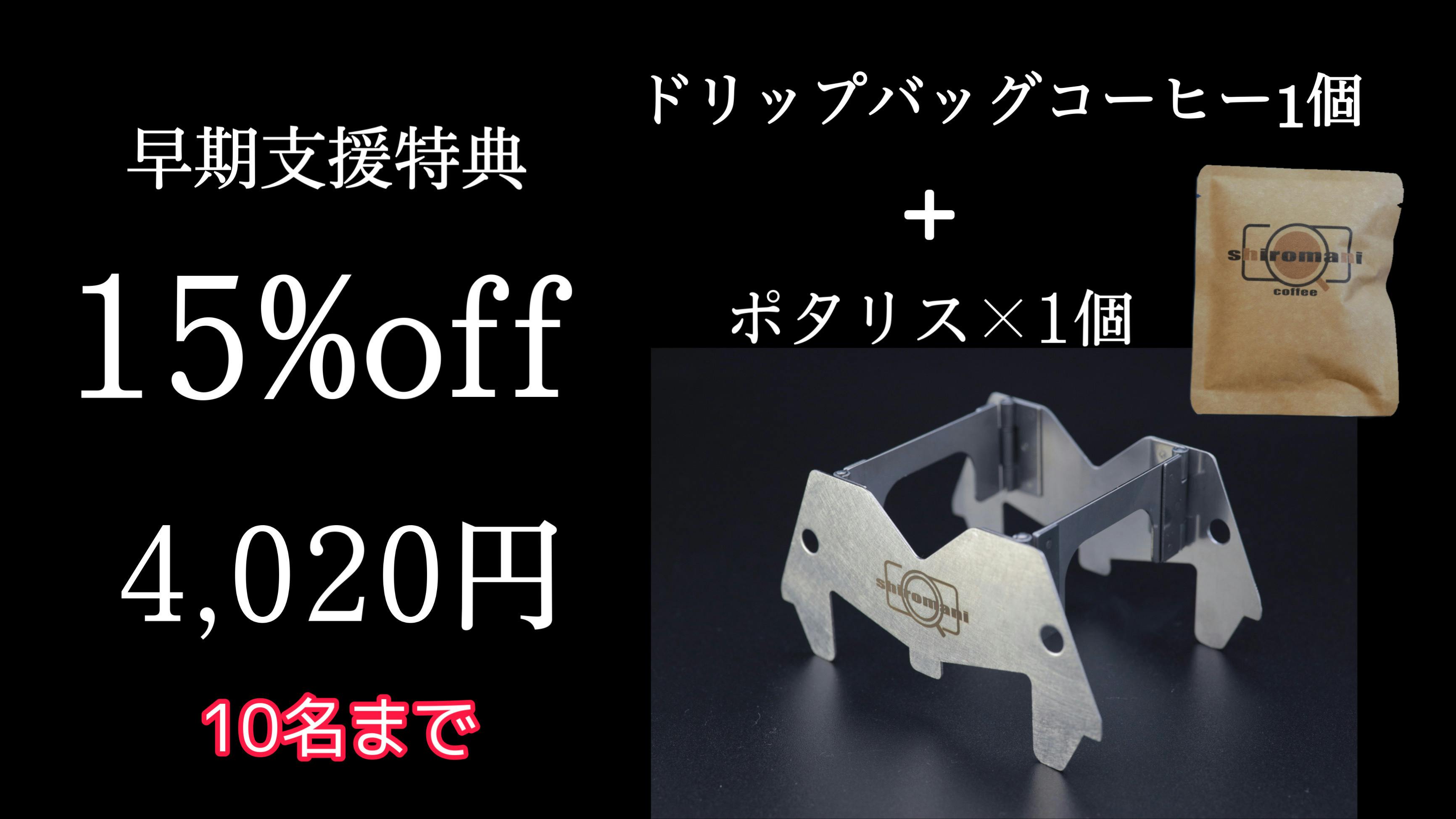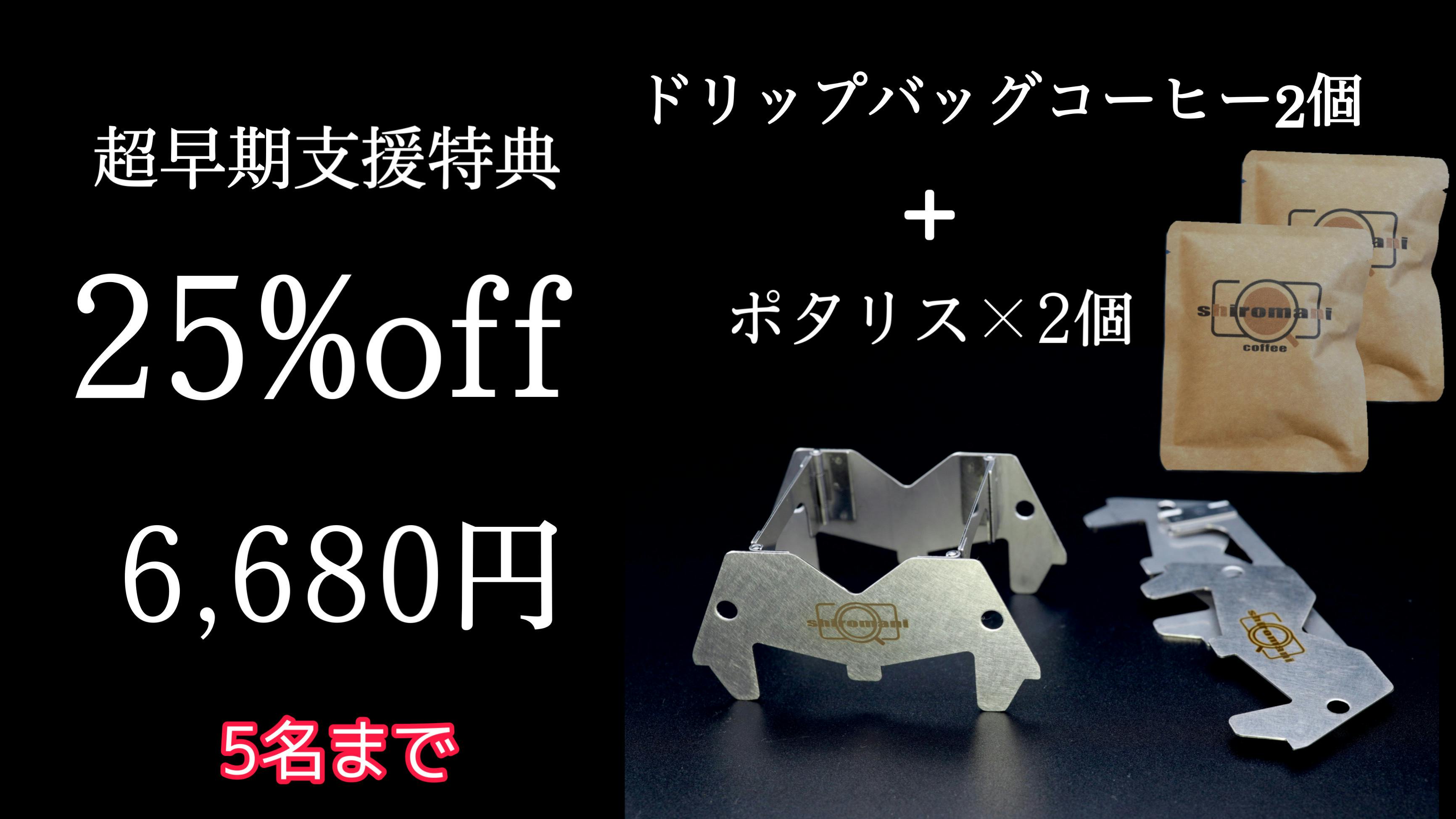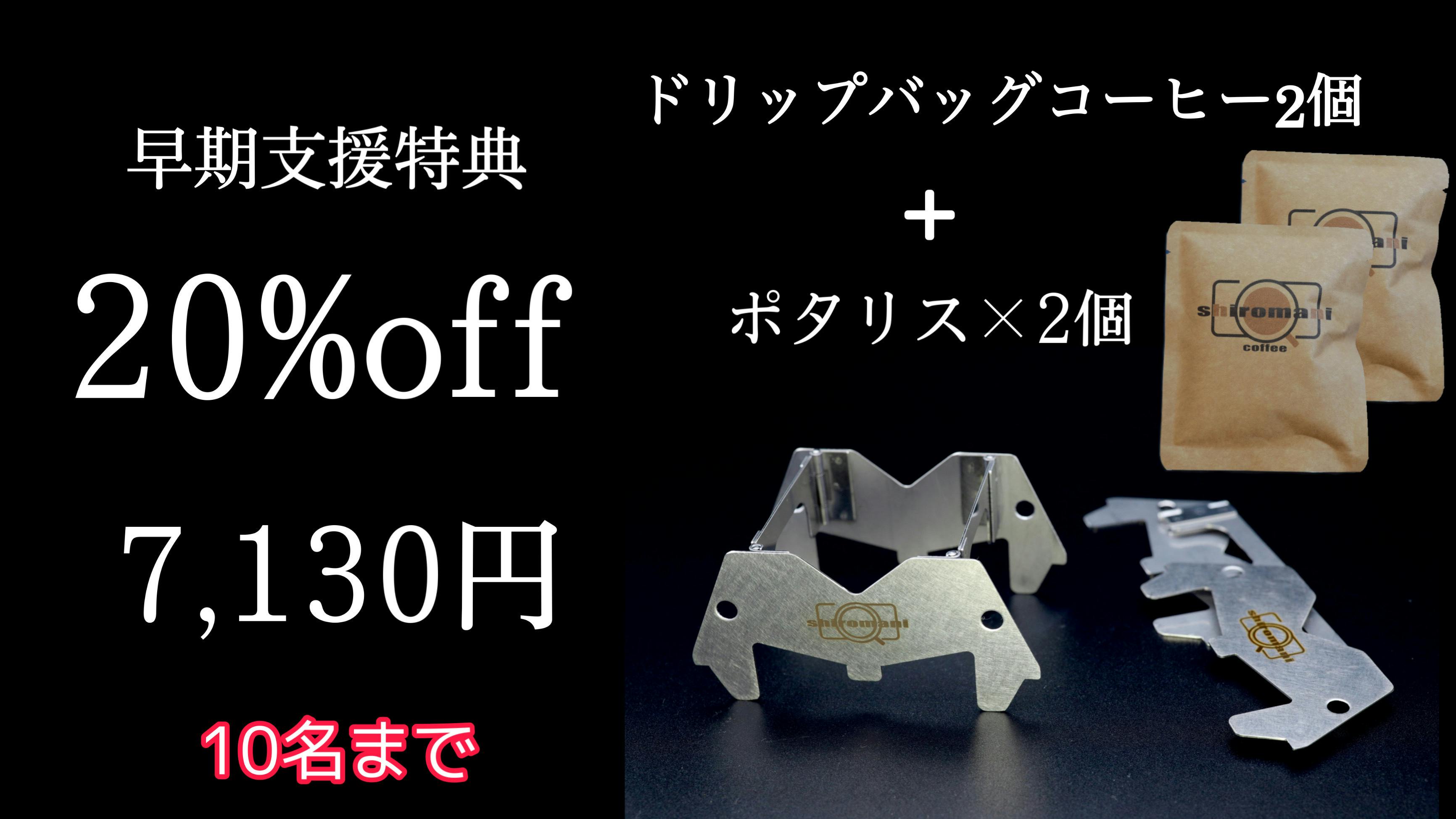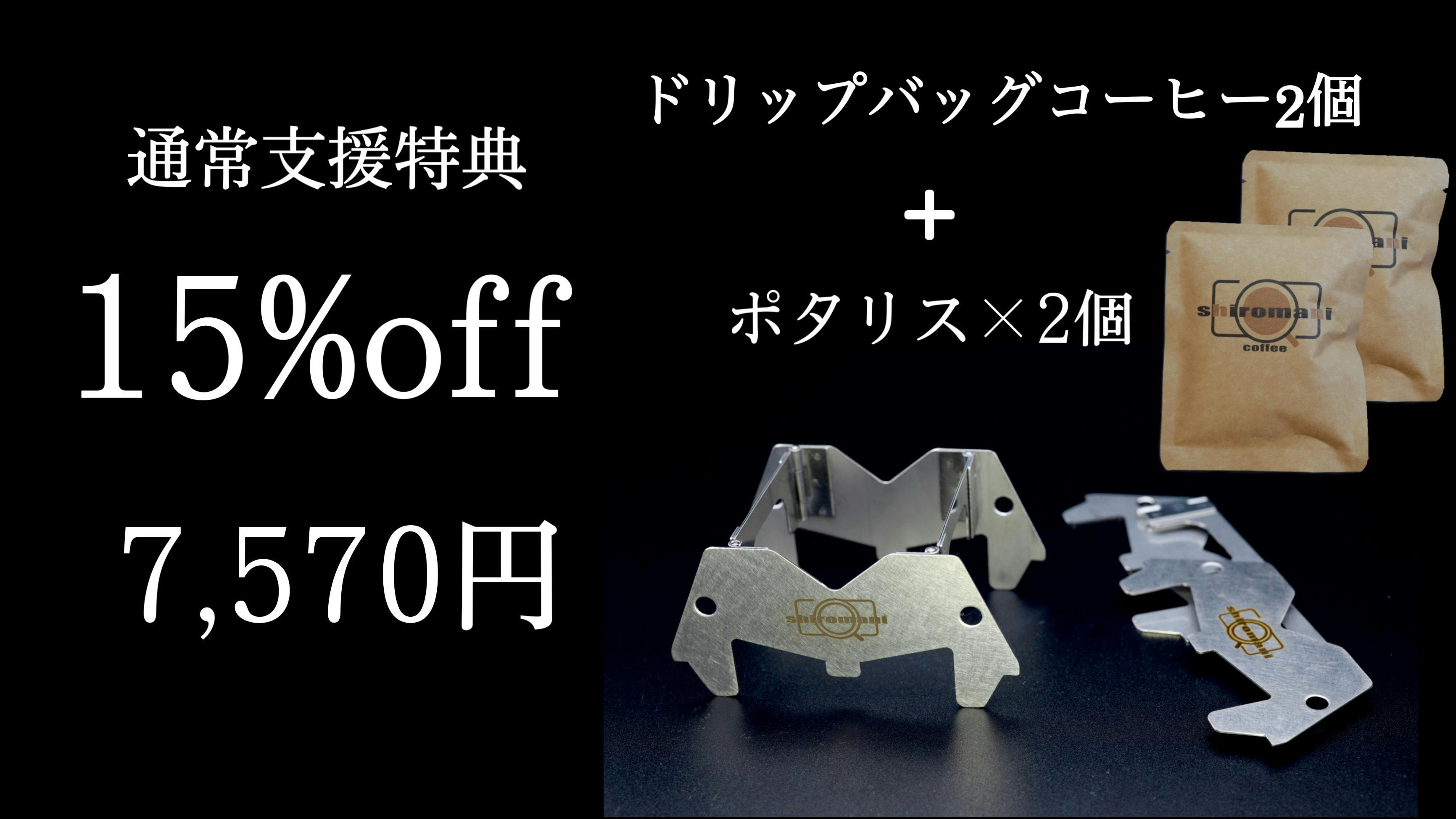 ポタリス本体にshiromaniドリップバッグコーヒーをお付けして支援割引価格でお届けいたします。