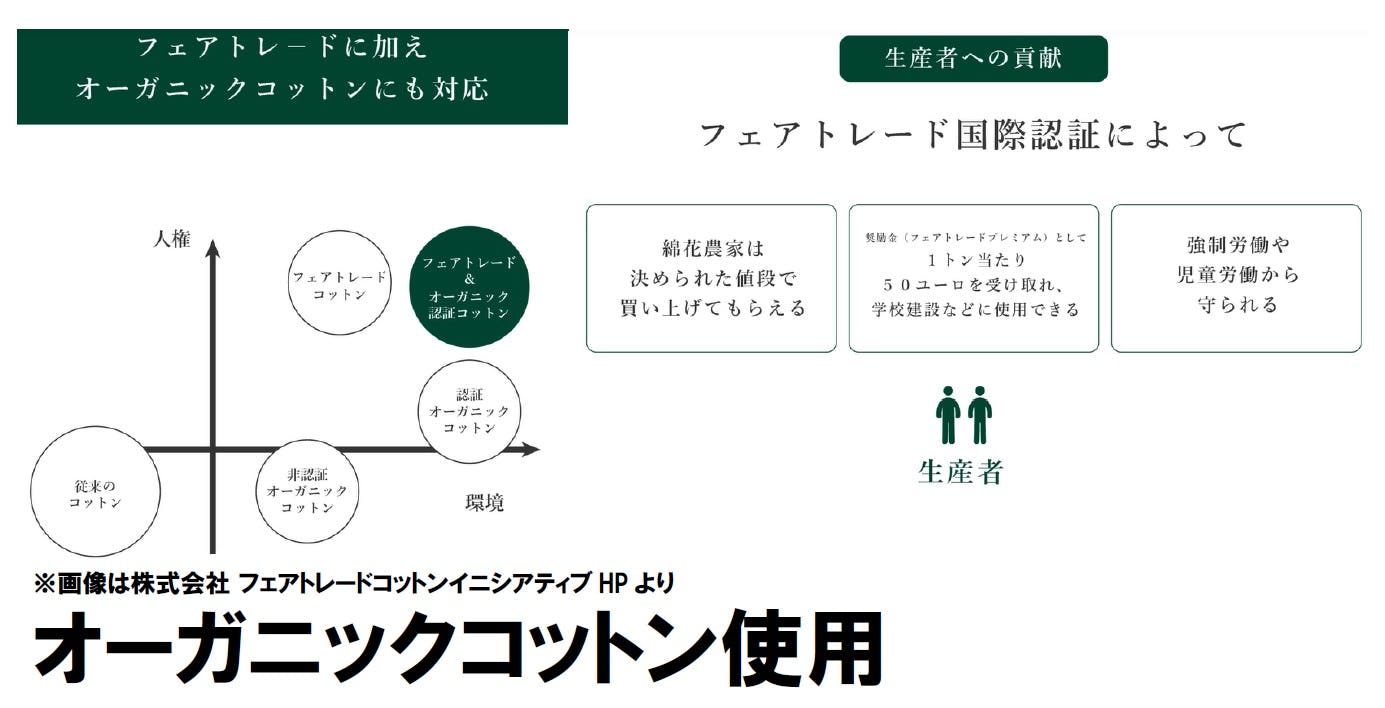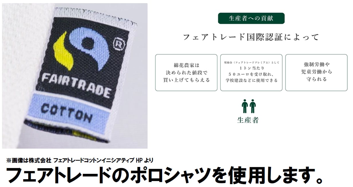 (*2)フェアトレード商品とは、公正な社会を作るために立場の弱い(主に開発途上国の)生産者や労働者の生活改善と自立を目指す貿易の仕組みです。例えば、フェアトレード商品は、児童労働、健康被害・環境破壊につながる農薬の大量散布等を認めていません。また、今回ポロシャツ仕入れ先である「SCOO」さんは、売上を活用し、生産国で学校運営をしています。