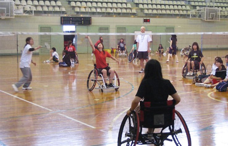 写真は、大学の授業「アダプテッド・スポーツ」(大槻洋也 教授)での車椅子バドミントンの様子です。