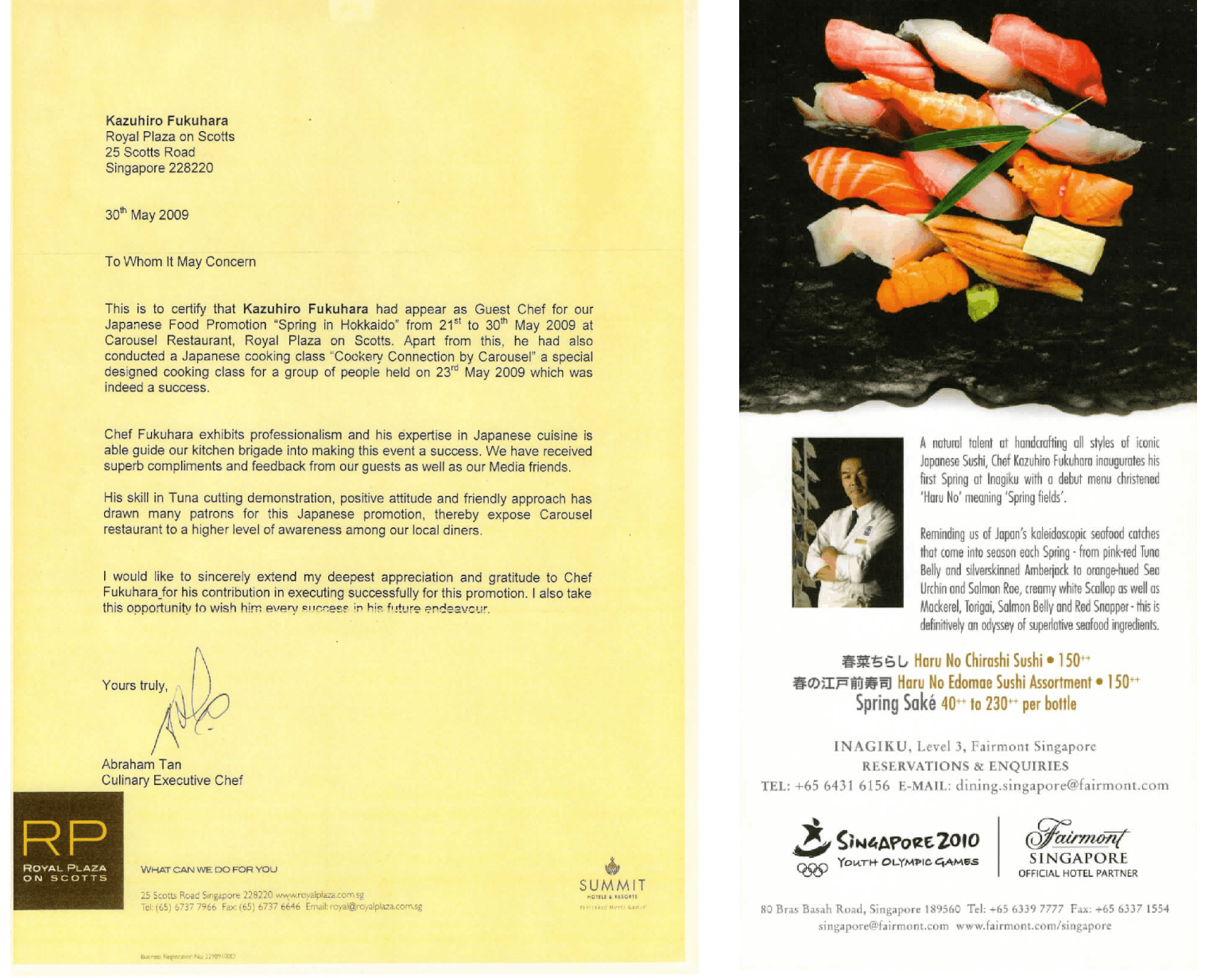 ※【左】ブルネイ石油王から感謝状 、【右】フェアモントホテル(シンガポール)握りイベント