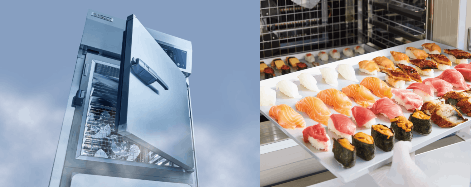 そこでメーカーさんにご協力頂き、「シャリ」の水分をほとんど奪うことなく、湿度を保って冷気で均一に急速冷凍する、3Dフリーザーという最新の機械があることを知りました。