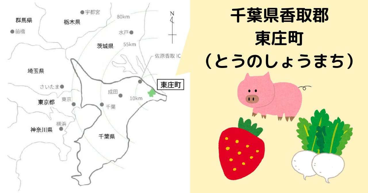 東庄町はチーバくんでいうと耳の付け根ぐらい、千葉県北東部に位置する、人口約1万3000人ほどの小さな町です。