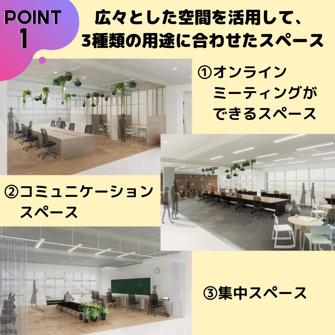 796㎡の広々とした空間が、集中して取り組むスペースと、個別ブースも設置されたオンラインミーティング可能なスペース、コミュニケーションが可能なスペースになりました。それぞれの用途に応じて活用いただけます。