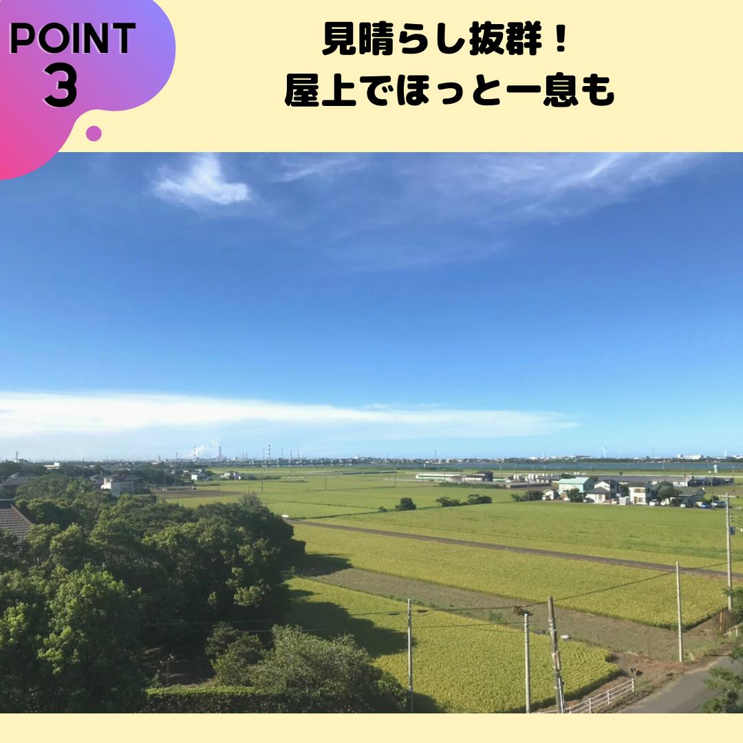 パソコン仕事で目が疲れたときや、一息つきたいときに、屋上でホッと一息つくのもおすすめです。仕事の合間や仕事終わりに田んぼ道を散歩したり、釣りをしたり、さまざまなアクティビティもすぐにできる場所です。(ハタラキバには、カフェスペースもご用意予定です。)