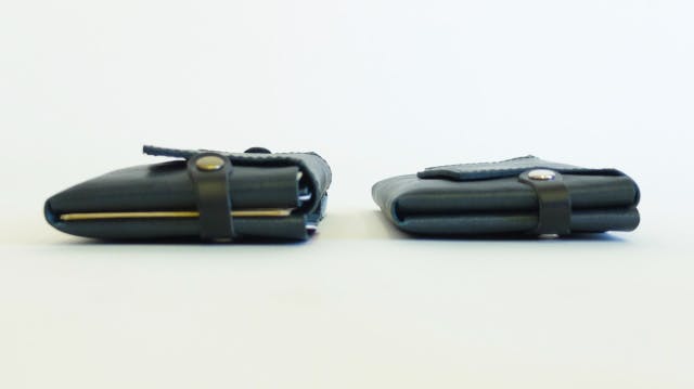 通常財布は19cm。サイドを縫い、カードを横並びにするとこの大きさになります。マチは内側に折りこみタイプが一般的なのですが、革が4枚重なり厚みが出ます。
