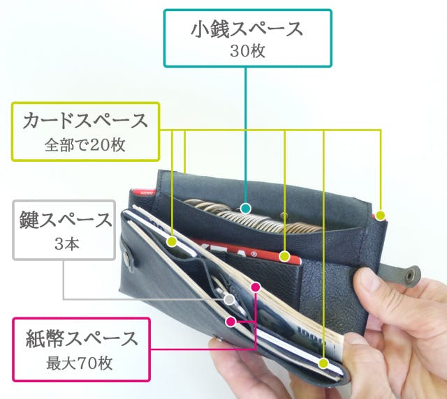1、お札もカードも持ちたい!お札30枚、カード20枚、小銭30枚、鍵3個