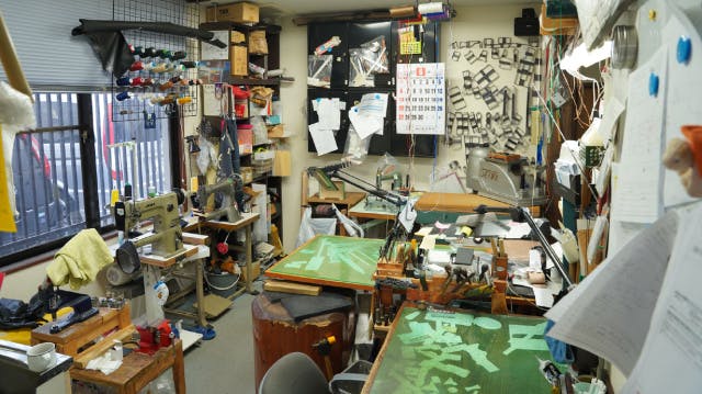 ショップ奥の工房の風景です。金型や各種機材など多岐にわたる道具が並びます。