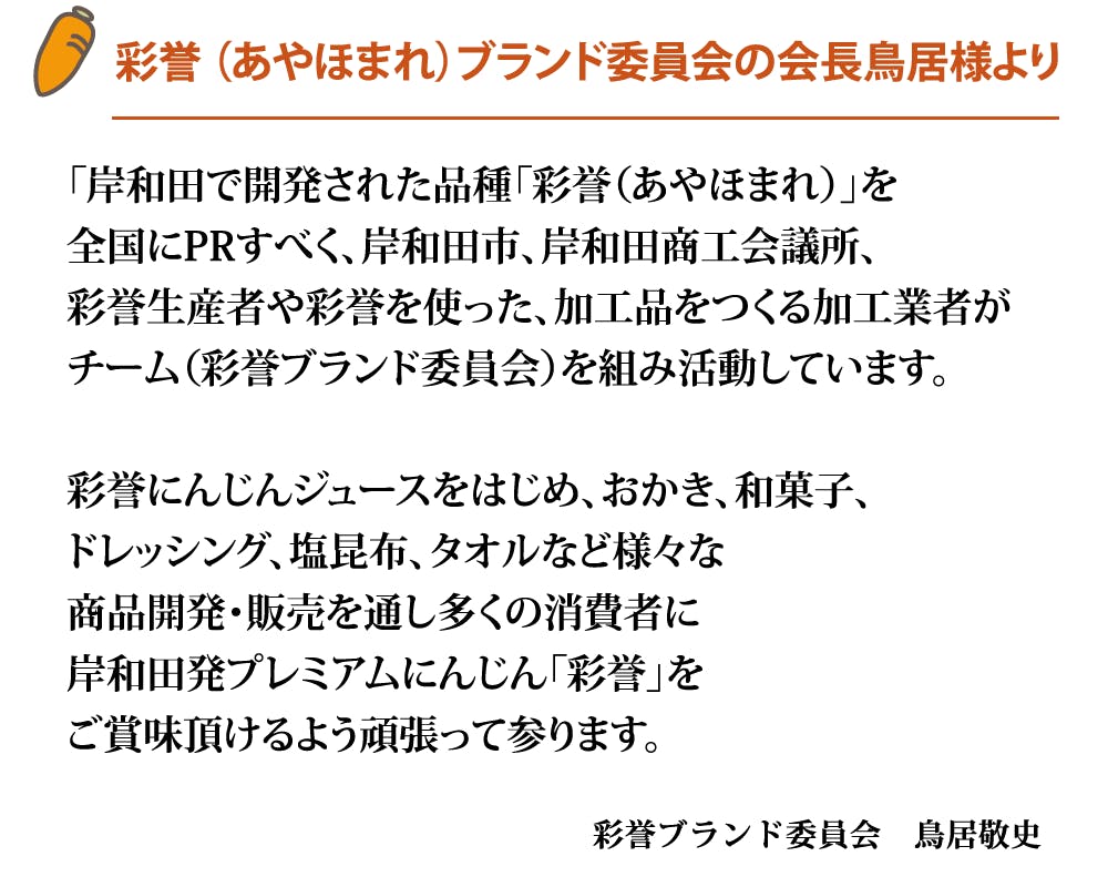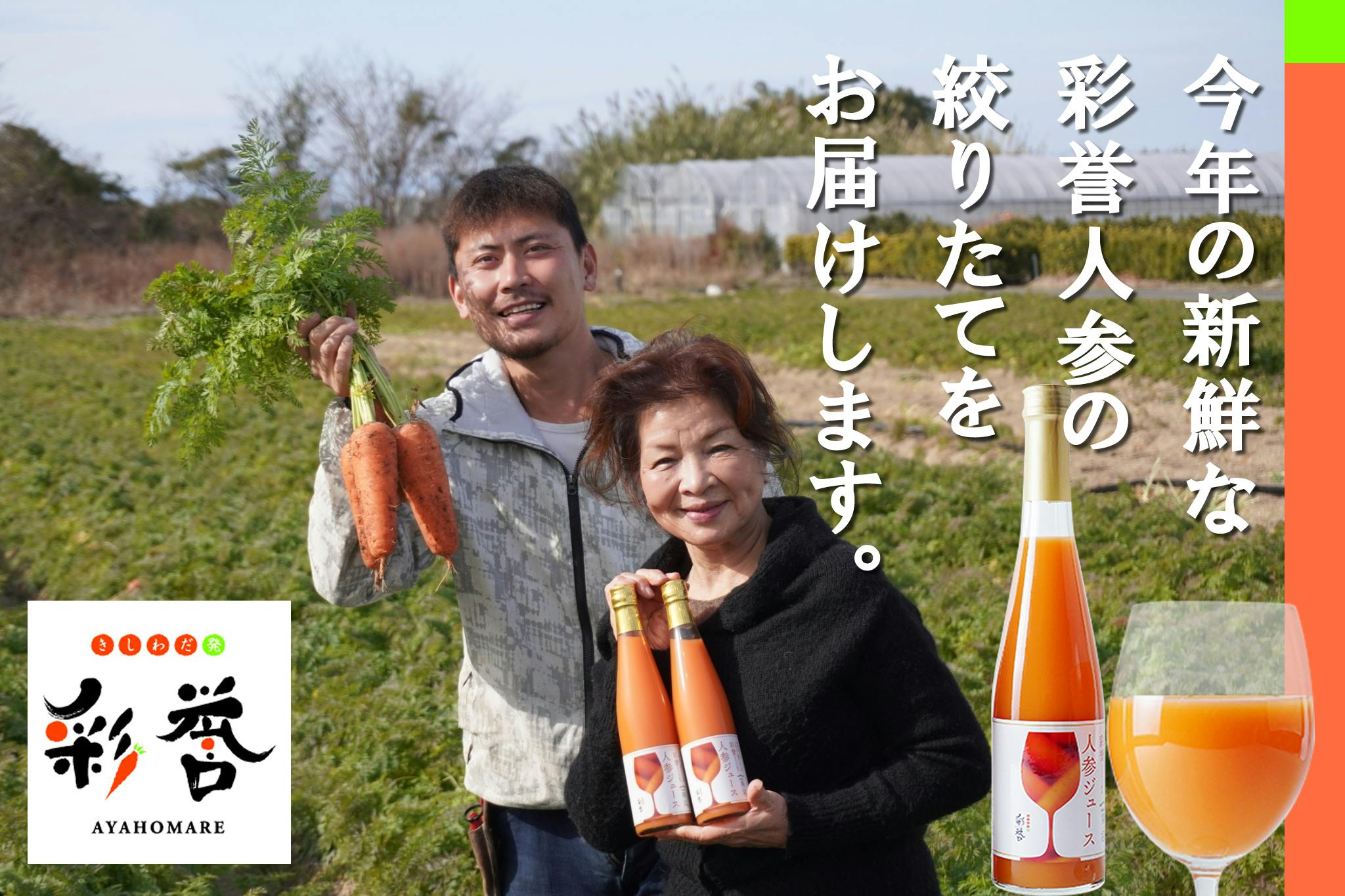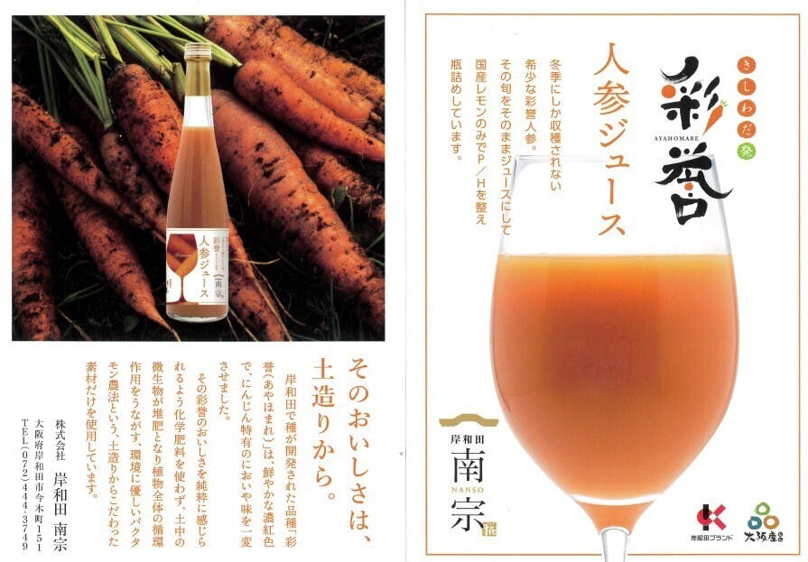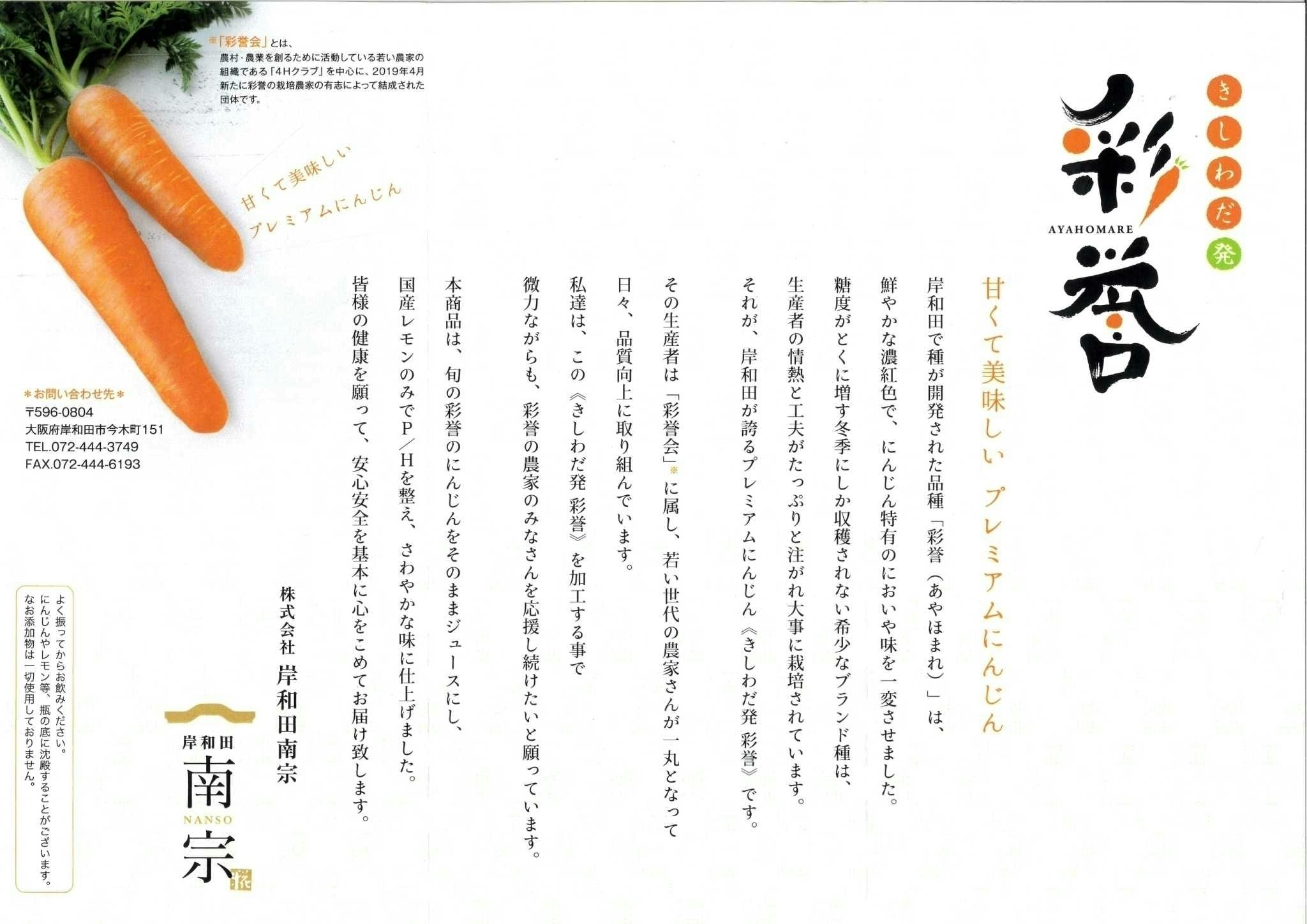 南農園の南さんとの出会いは、岸和田商工会が開催している岸和田ブランド委員会に参加した時でした。彩誉(あやほまれ)の人参をなんとかブランド化するためのお手伝いができないかと、ジュースに加工する提案をしました。南さんの作る彩誉(あやほまれ)は一番色合いも鮮やかで、わずか3ヵ月の冬の生産だけ年間10t作る本気の若い農家さんです。毎年研究を重ね、今年の糖度は13度まであがり、フルーティーな彩誉(あやほまれ)となりました。この彩誉(あやほまれ)で作るジュースをぜひ皆様に味わっていただきたいと思っております。どうぞ応援よろしくお願いいたします。