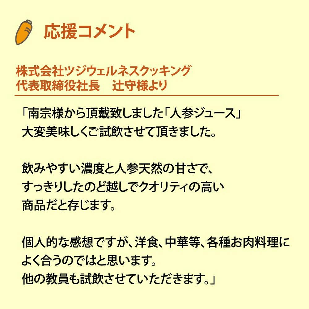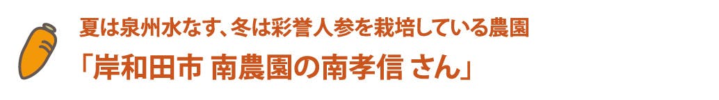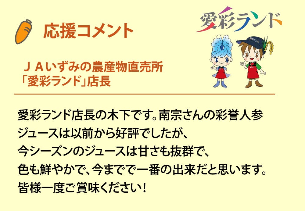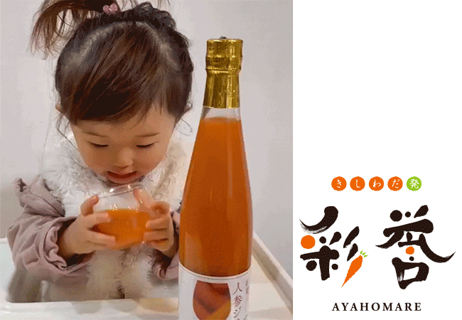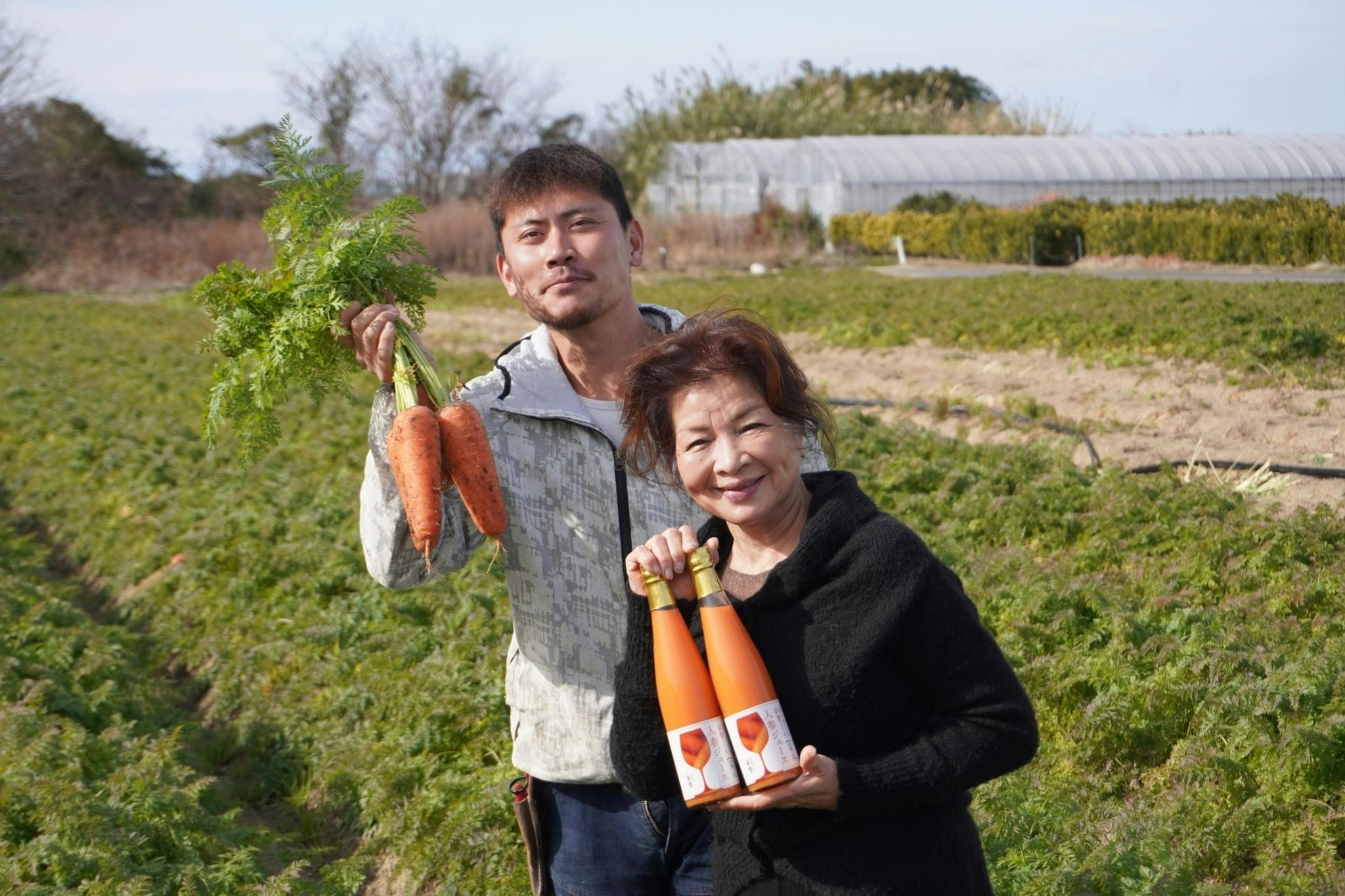 南農園の南さんとの出会いは、岸和田商工会が開催している岸和田ブランド委員会に参加した時でした。彩誉(あやほまれ)の人参をなんとかブランド化するためのお手伝いができないかと、ジュースに加工する提案をしました。南さんの作る彩誉(あやほまれ)は一番色合いも鮮やかで、わずか3ヵ月の冬の生産だけ年間10t作る本気の若い農家さんです。毎年研究を重ね、今年の糖度は13度まであがり、フルーティーな彩誉(あやほまれ)となりました。この彩誉(あやほまれ)で作るジュースをぜひ皆様に味わっていただきたいと思っております。どうぞ応援よろしくお願いいたします。
