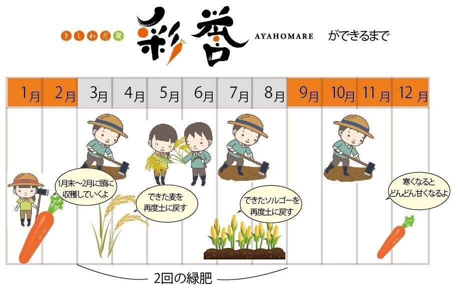 岸和田発の彩誉(あやほまれ)にんじんを広めるために、岸和田の4Hクラブに所属し、「彩誉(あやほまれ)」 をより甘い美味しいにんじんとして作り上げるためにメンバーのみんなで試行錯誤し、 考えつくした製法として、2回の緑肥を行う製法を発見しました。