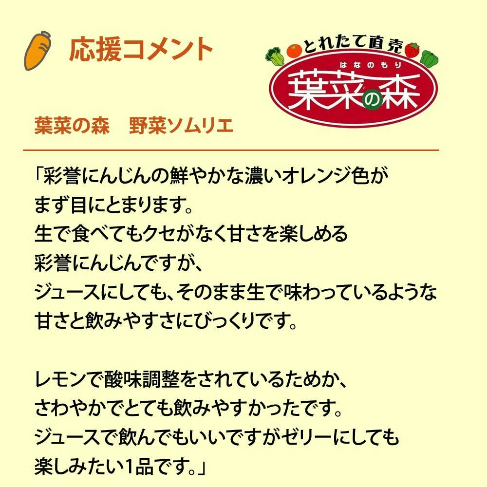 土造りからこだわり抜いたことで人参特有のクセを抑えて、甘みを引き出すことに成功した「彩誉(あやほまれ)」を、もっと皆様に手軽に美味しく召し上がっていただくため、旬の味をそのままジュースにしました。