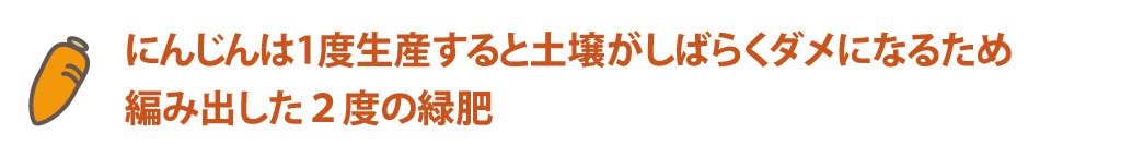 にんじんは土の養分をたくさん吸収するため、通常は3年ほど土壌を回復させてないと、おいしいにんじんはできません。あの高麗人参でさえ、採取した後の土地は、養分をすべて吸い取られているので、次に作物を植えるのに10年も土壌を休ませなければなりません。