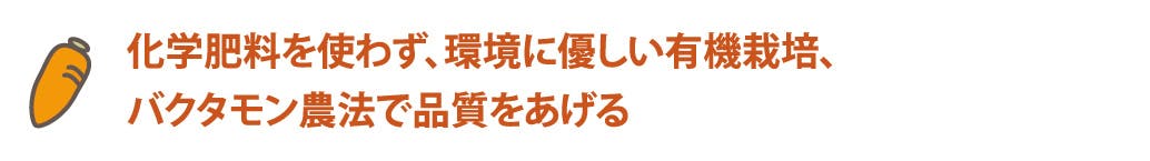 その彩誉(あやほまれ)のおいしさを純粋に感じられるよう化学肥料を使わず、土中の微生物が堆肥となり植物全体の循環作用をうながす、環境に優しいバクタモン農法という、土造りからこだわった素材だけを使用しています。