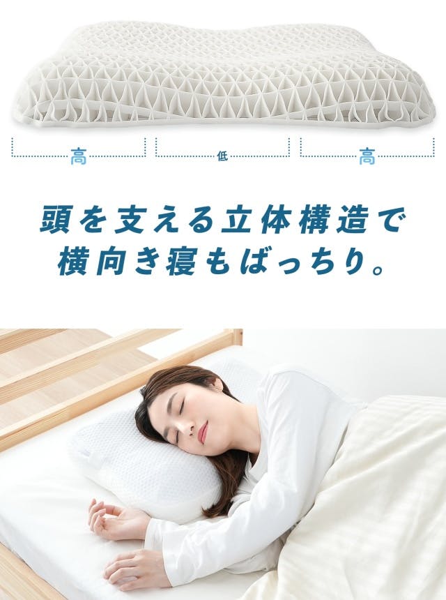 A. 立体構造により横向きで寝た場合でもしっかりと高さを保ち、サポートするため横向き寝でも快適にお使いいただけます。沈み込みすぎないほどよい硬さなので、寝返りも打ちやすい仕様となっております。
