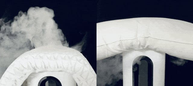三角格子構造×ハニカムメッシュは空気を通しやすい構造なので、体圧分散まくら KUMO+と、弊社従来品のポリエステルわた枕を加湿器の上に枕を置いてみると、明らかに通気性の違いが見られました。