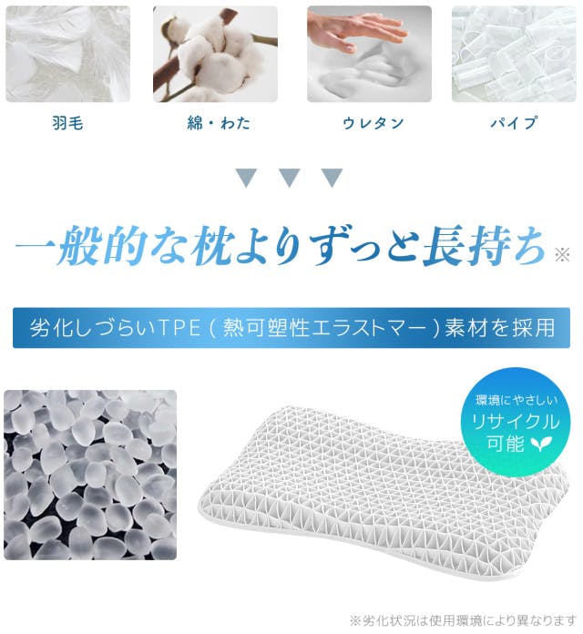 特に、ベースとなる重要なゲル枕はTPE(熱可塑性エラストマー)で出来ており、ニオイ・カビなどが発生しにくい素材なのでその他の枕より清潔を保ちながら快適にお使いいただけます。