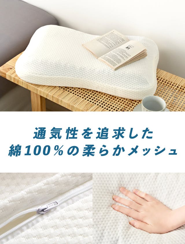 枕カバーの素材は肌にやさしい綿を100%使用。通気性のよい中材の性質を損なわないよう、風通しのよいメッシュ生地に仕立てています。
