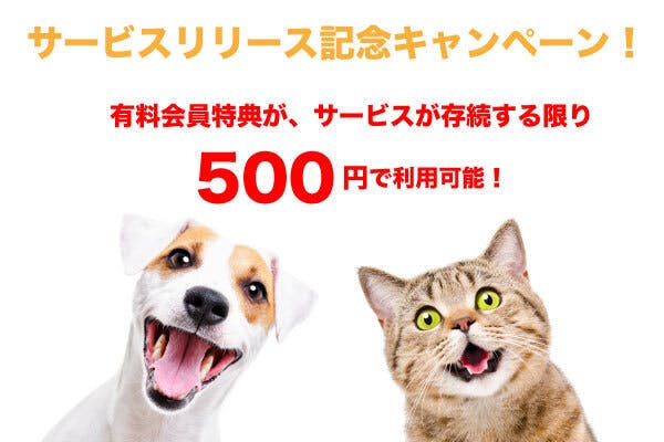 サービスのリリース記念に伴い、amor pet(アモル ペット)を長くご利用いただき、広く普及させるため、男女共に有料プランの月会費が毎月4,300円掛かるところ、500円のご支援にてサービスが存続する限りご利用いただけます!