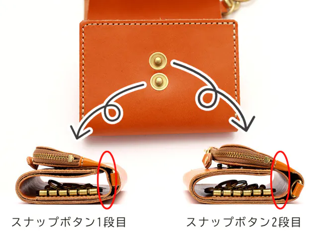 そこで、「スマートキー2個」を並列で収納してもフタが閉められるよう、スナップボタンを2段階調整としました。